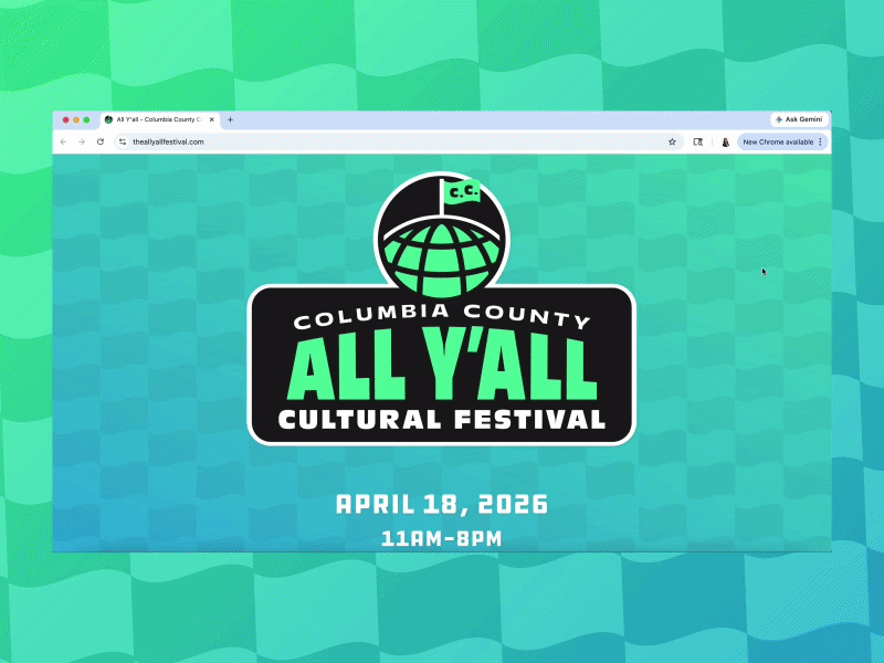 When Columbia County Parks, Recreation, and Events approached us to help with a new identity for the spring cultural festival, our gears started turning. The resulting "All Y’all" identity does a little two-step between front-porch charm and global perspective, which is exactly the point. The globe mark, stamped with a “CC” pin, grounds the festival in Columbia County while signaling that the stories, flavors and sounds on display stretch well beyond it. From a systems standpoint, the blue-to-green gradient brings energy and cohesion, drawing from the natural world to create something that feels vibrant, unified and alive. It’s a flexible, ownable brand built to show up everywhere, from signage to social, designed to feel as welcoming and wide-reaching as the festival itself.